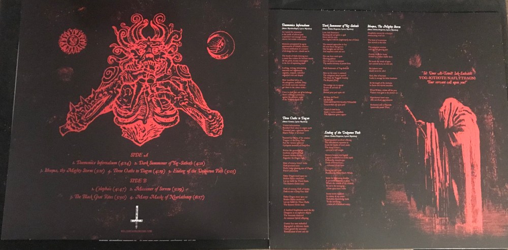 ‘Three Oaths to Dagon’ follows ‘Daemonica Infernalium’ thematically with the continuing exchanges of black metal and heavy metal stylings, changing rhythm patterns and tempos frequently. The title track of the album leans more towards NWOBHM-styled guitar riffs paired with bouts of faster blastbeats and periods of slower anthemic refrains with great emphasis on downbeats.