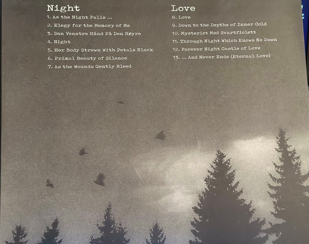 The final proper song on Night & Love is ‘Forever Night Castle of Love,’ which is an all-acoustic track that utilizes nylon-stringed acoustic, clean vocals, light keyboard accents, and vocal harmonizations. For a black metal album, this is certainly a strange track, as it contains no trace of anything ‘metal’ related whatsoever. Regardless, it’s an interesting track, it fits the album well, and it’s a great palette cleanser when the record is experienced as a whole piece.